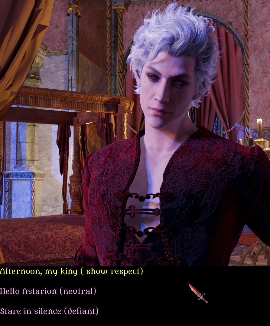 This Astarion fan game is an interactive fanfiction with multiple endings and dialogue choices.